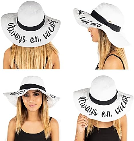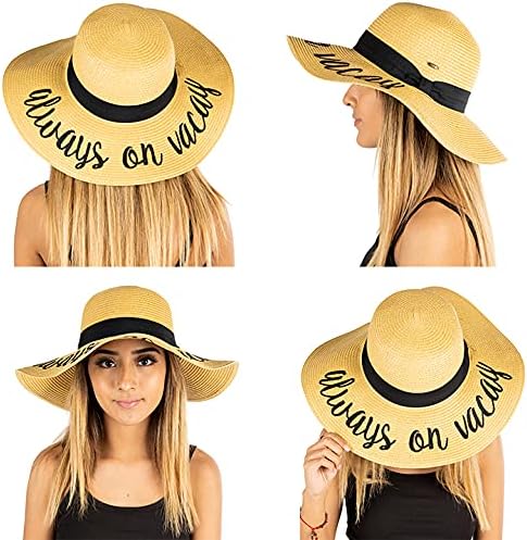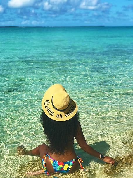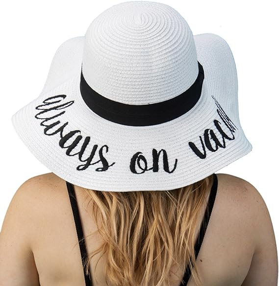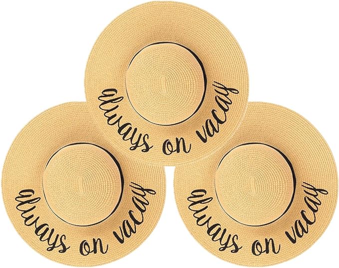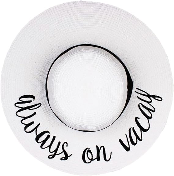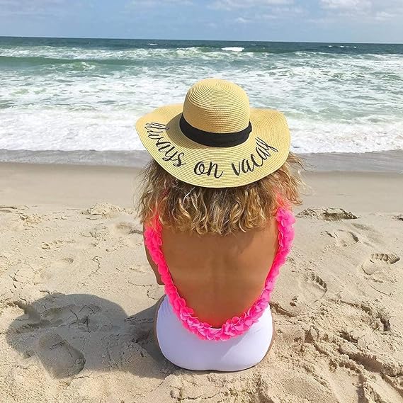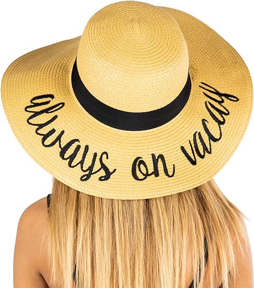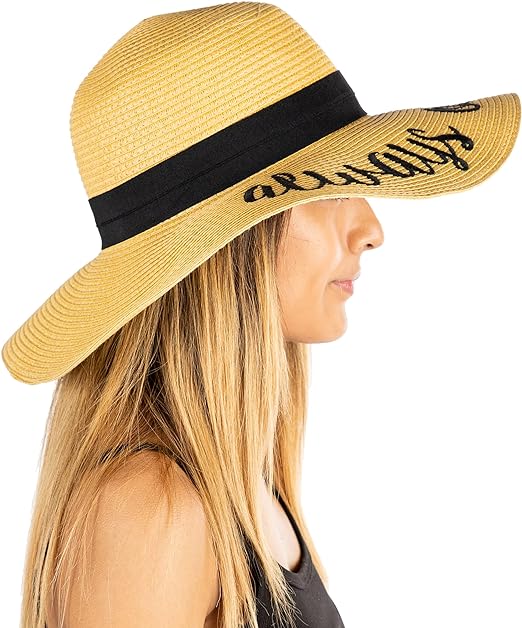 This 100% paper sun hat is lightweight yet thick and soft, offering a luxurious feel. The hat fits most with a height of 4.5 inches and a 4-inch brim; the 24-inch circumference can be adjusted with an internal drawstring. Stylish for ladies, teens, and tweens, it features bold cursive lettering. Versatile, it pairs well with everything from dresses to swimsuits.