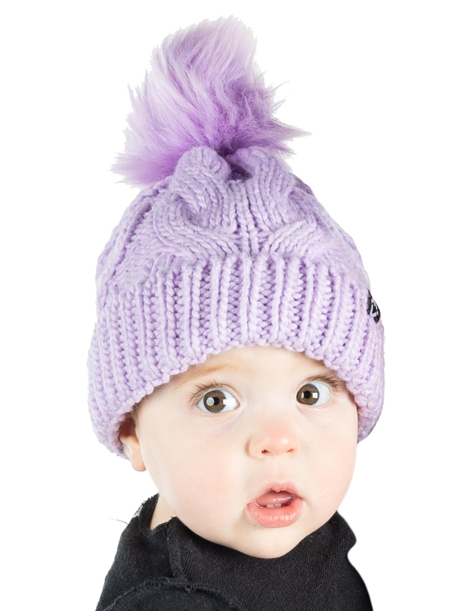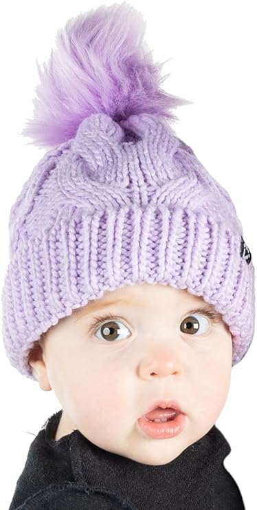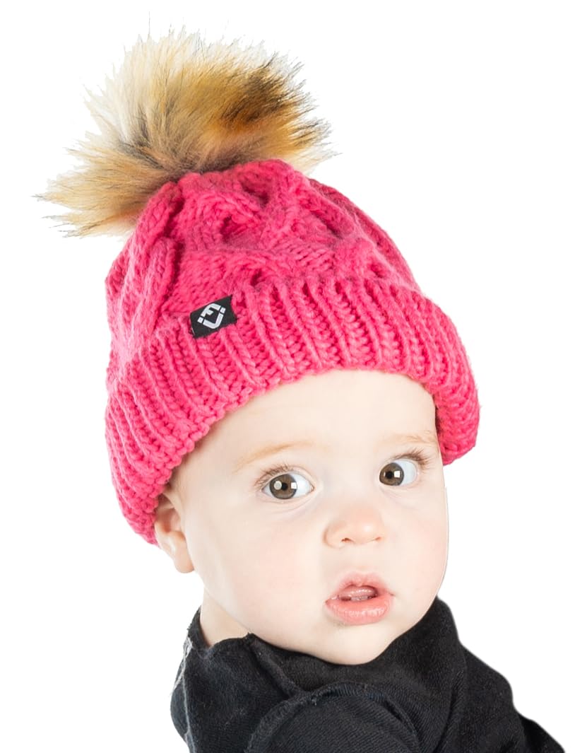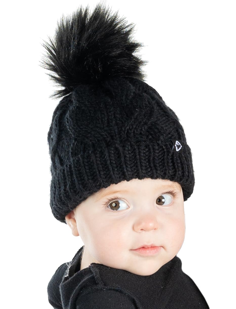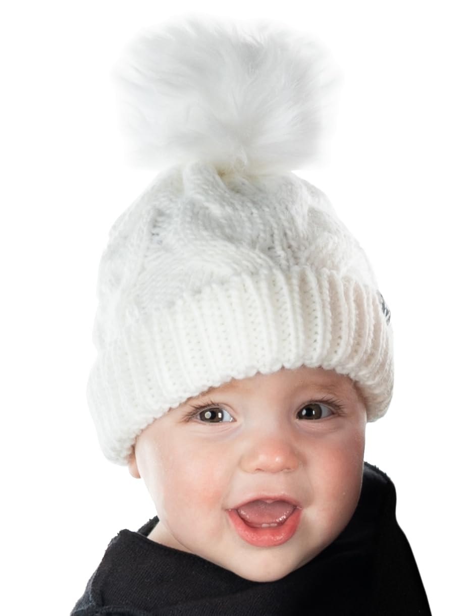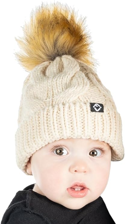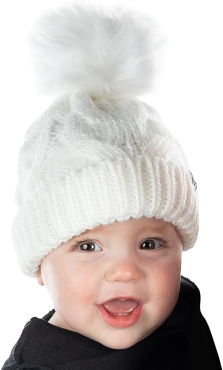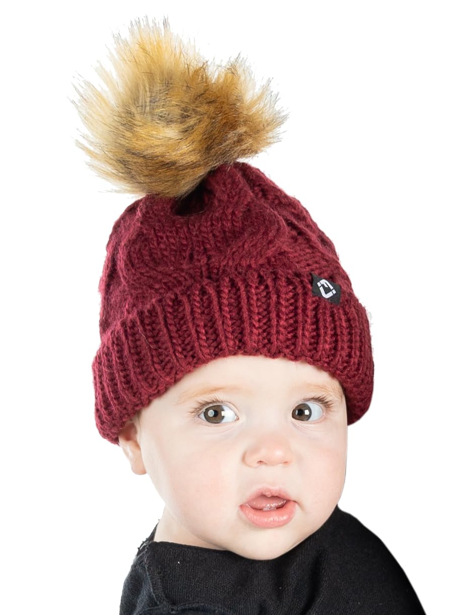 - GREAT QUALITY: Our pom pom beanie for babies and toddlers is crafted from 100% acrylic, giving it long-lasting durability and a luxurious soft touch. The soft fleece lining that covers your little ones’ ears will keep them comfortable in the harshest of weather. The cable knit pattern is intricately woven for a luxurious look and feel and is made to endure everyday wear and tear. The pom-pom is crafted with high-density faux fur that keeps its shape and appearance over time. Hand wash only.