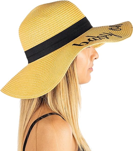 This 100% paper sun hat is lightweight yet thick and soft, offering a luxurious feel. The hat fits most with a height of 4.5 inches and a 4-inch brim; the 24-inch circumference can be adjusted with an internal drawstring. Stylish for ladies, teens, and tweens, it features bold cursive lettering. Versatile, it pairs well with everything from dresses to swimsuits.