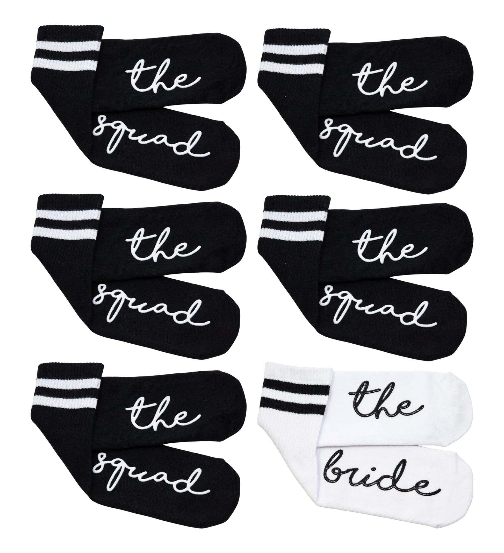 - GREAT LOOK: Representing modern bridal elegance, these socks serve as an embodiment of chic and comfort. Enhance the overall party theme when these are paired with matching dresses, shoes, or other accessories. With these socks on, your feet don't just walk; they parade style, ensuring the bride and her squad are in the spotlight throughout. With striking "Bride" and "Squad" designs in black and white, they do not compromise on style, adding a contemporary touch to your party aesthetics.