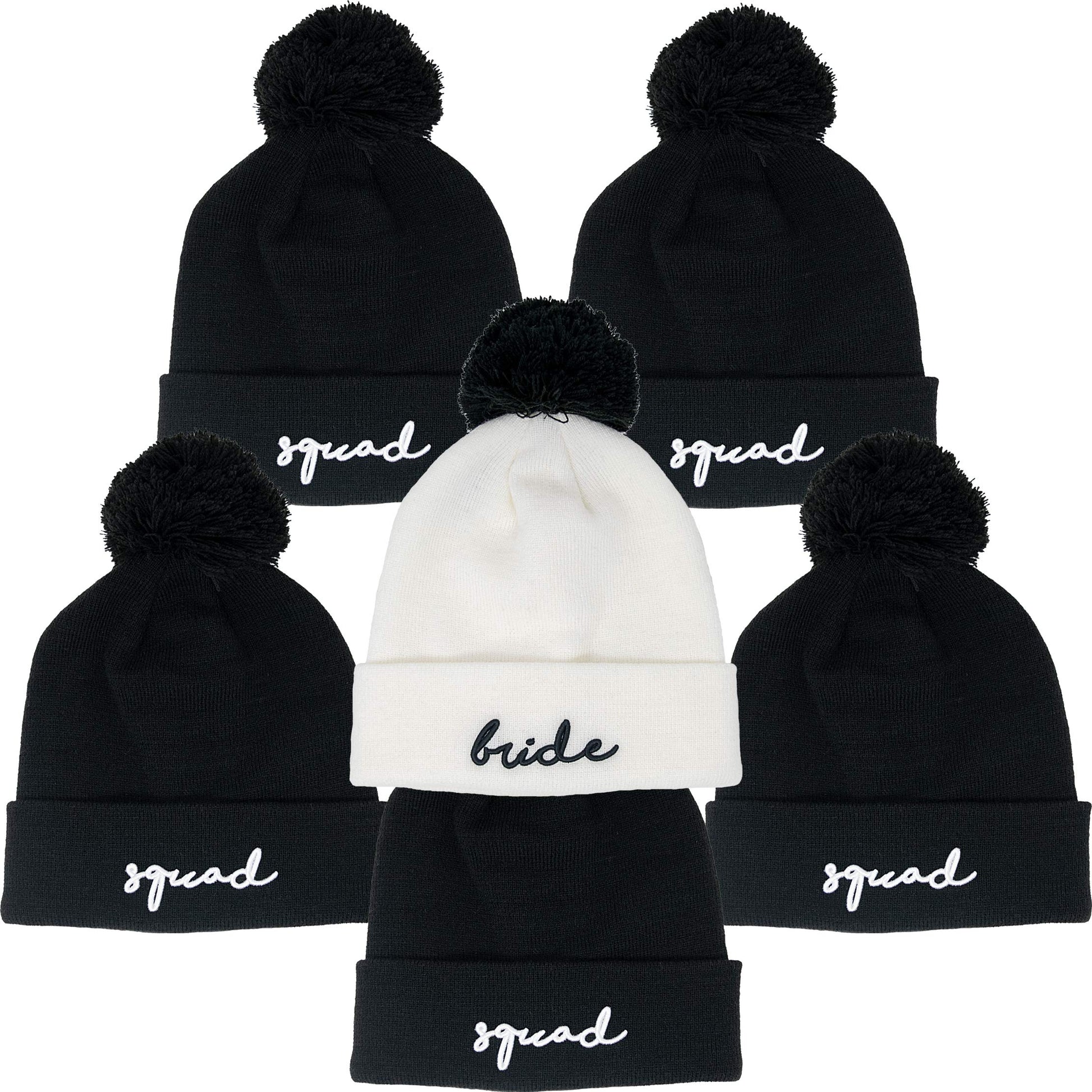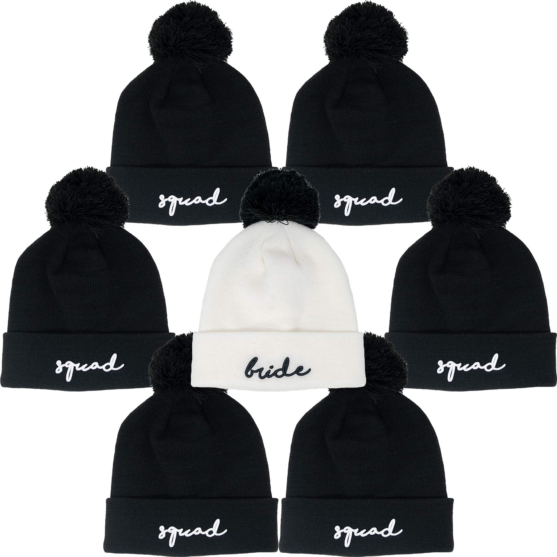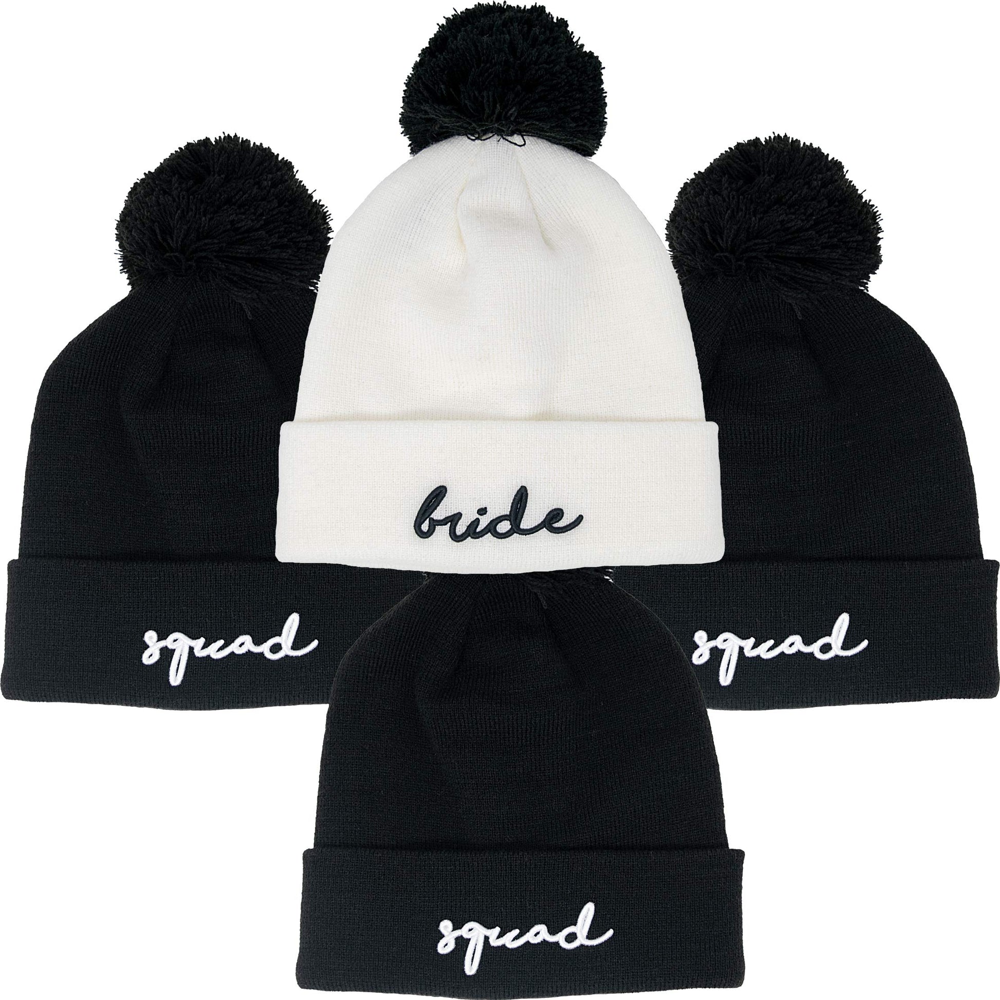 - GREAT LOOK: Be trendy with your bride besties with these adorable bride and bride squad knit pom beanies. Available in black with white embroidery for the bride squad and white with black embroidery and a black pom for the bride. Great to keep you warm in winter and fall but great to wear on cool days of spring and summer.