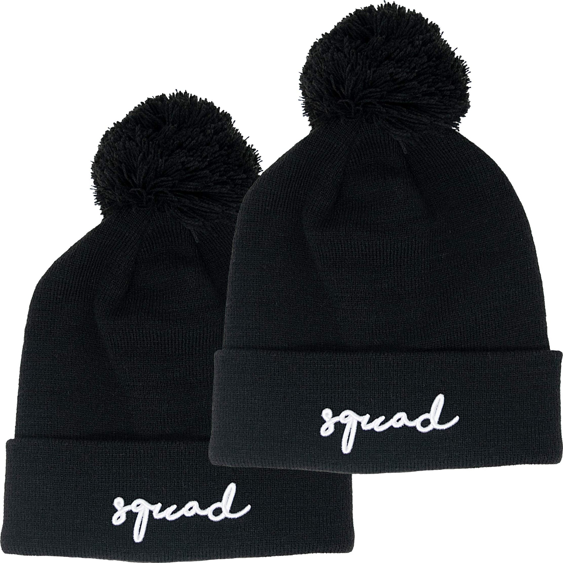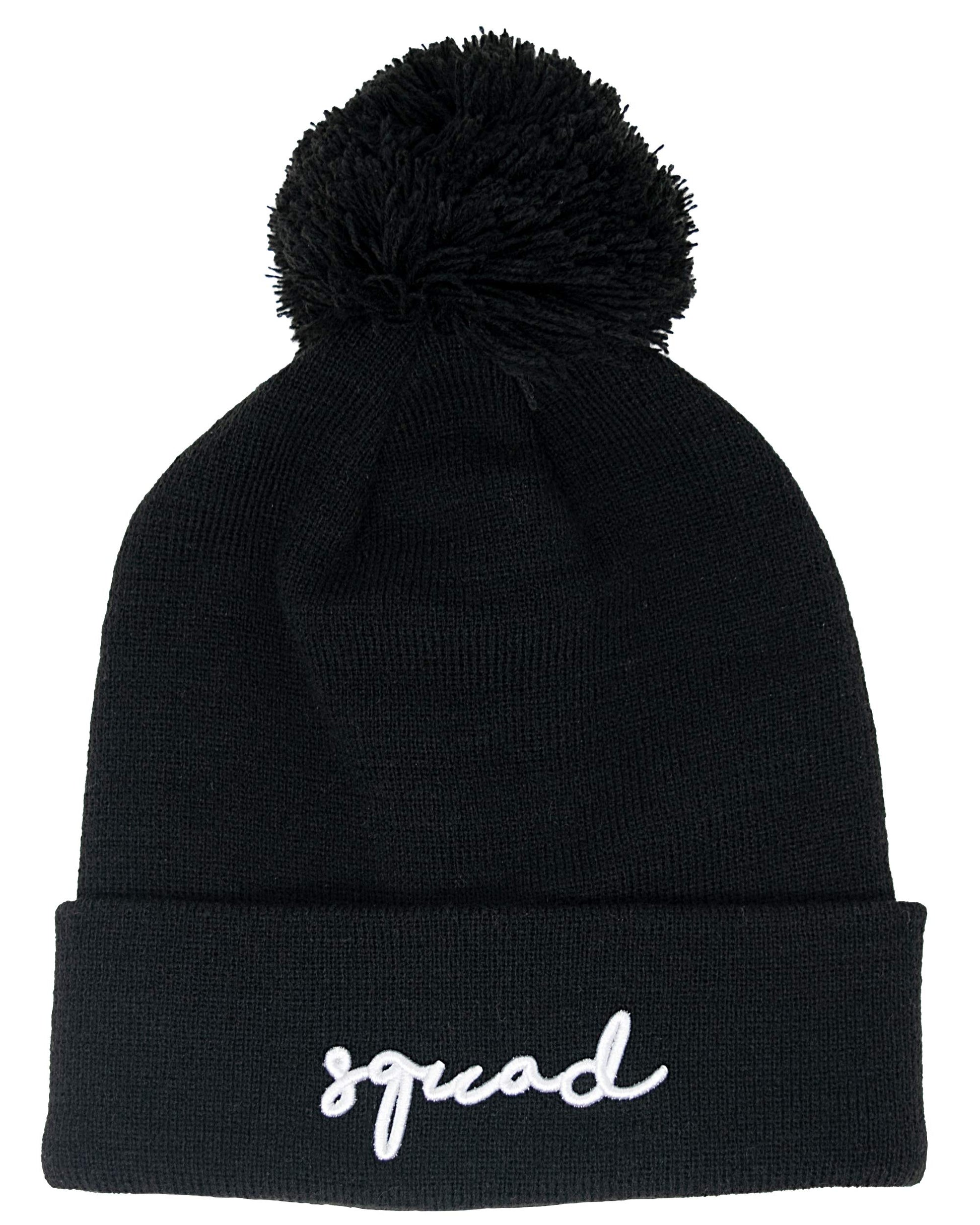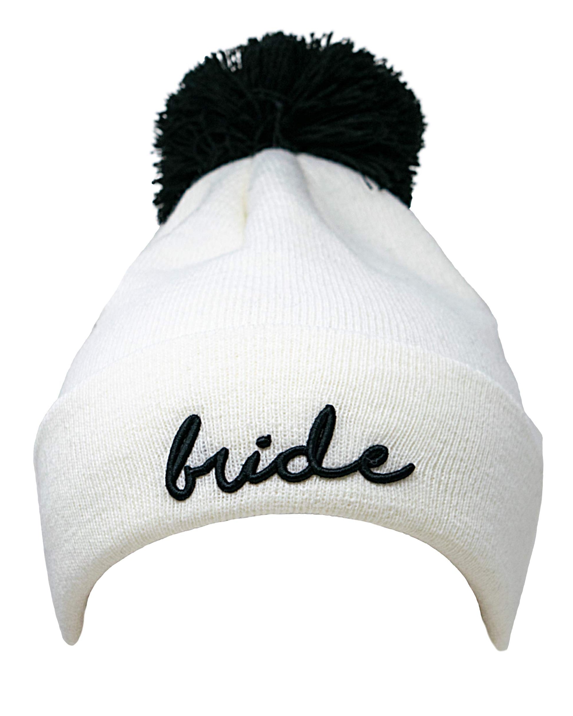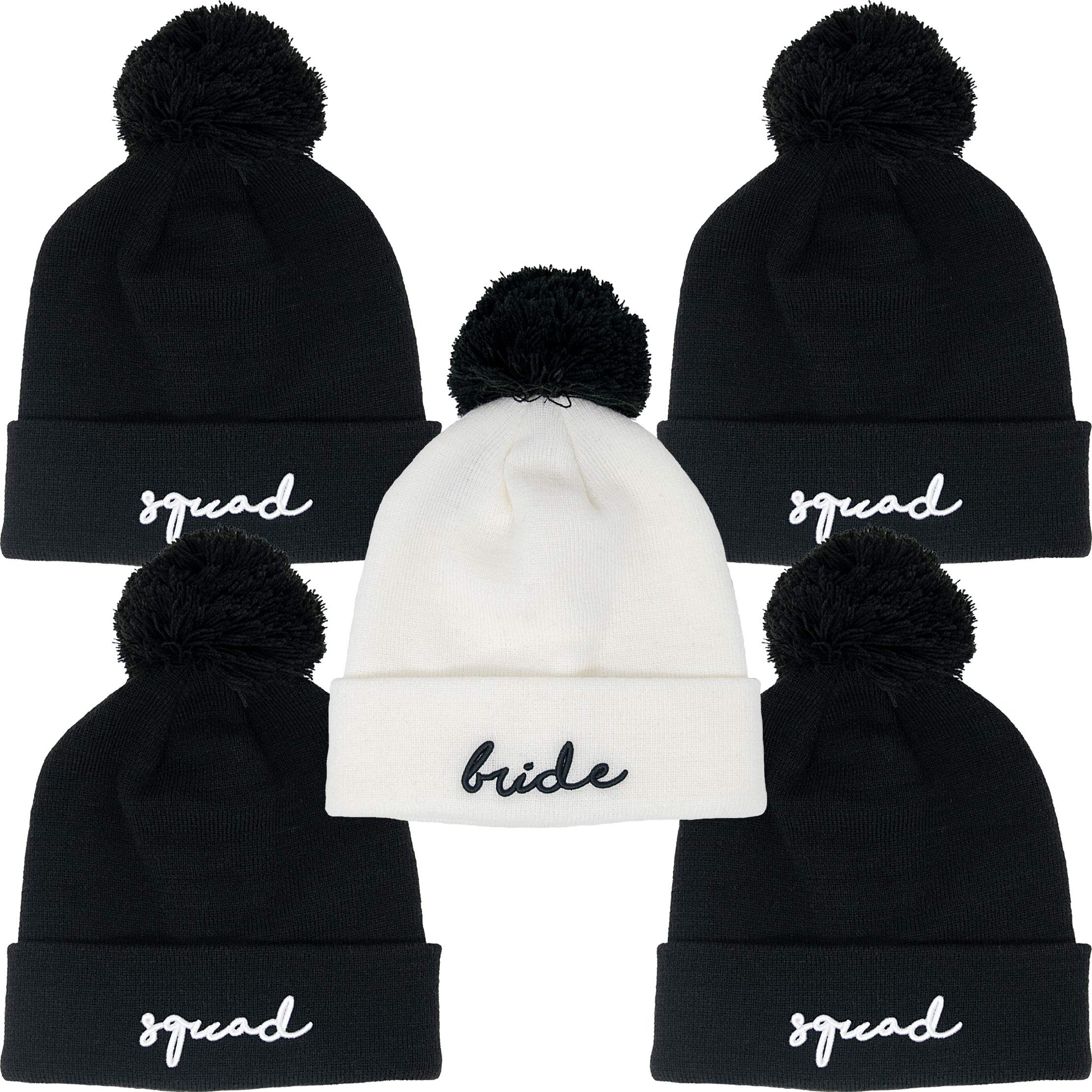 - GREAT LOOK: Be trendy with your bride besties with these adorable bride and bride squad knit pom beanies. Available in black with white embroidery for the bride squad and white with black embroidery and a black pom for the bride. Great to keep you warm in winter and fall but great to wear on cool days of spring and summer.