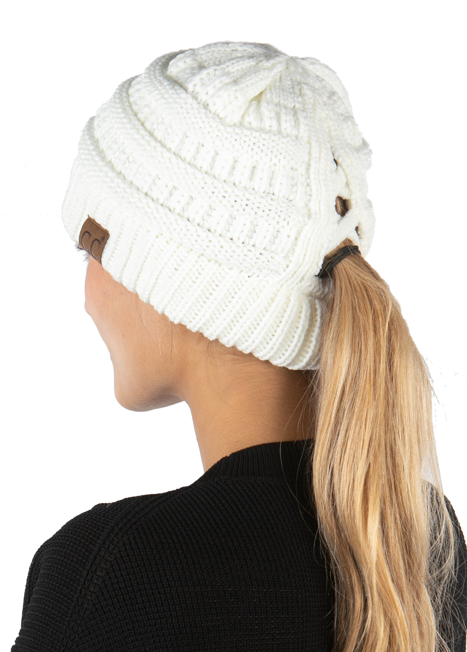 - GREAT FIT: One size fits most. Matches the fit as our regular ribbed knit beanie, but with the option of wearing your hair up. Measures 8” long by 9” wide lying flat. Lots of stretch. Comfortable, thick, cozy and cute, these criss cross BeanieTails are a great way to keep your hair up and out of the way. Wear hat tighter around the head for a high ponytail or bun, or back further and slouchy for a lower ponytail or bun.