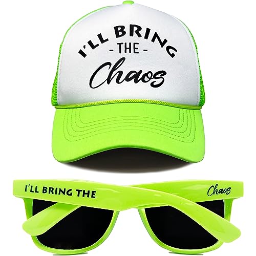 Trucker hats and matching sunglasses, ideal for parties and bachelorette events, combine style and comfort. Made of 100% polyester, the hats ensure all-day comfort. They fit a range of head sizes (20.5-23.5 inches) with an adjustable closure and feature a 2.75-inch brim. The sunglasses, crafted from sturdy plastic, offer a lightweight design with contoured arms and a snug nose piece. Measuring 5.25” x 1.75”, they fit easily in small bags. This duo is perfect for adding a fun touch to any party outfit.
