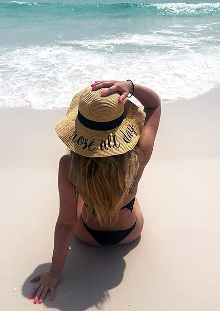 This 100% paper sun hat is lightweight yet thick and soft, offering a luxurious feel. The hat fits most with a height of 4.5 inches and a 4-inch brim; the 24-inch circumference can be adjusted with an internal drawstring. Stylish for ladies, teens, and tweens, it features bold cursive lettering. Versatile, it pairs well with everything from dresses to swimsuits.