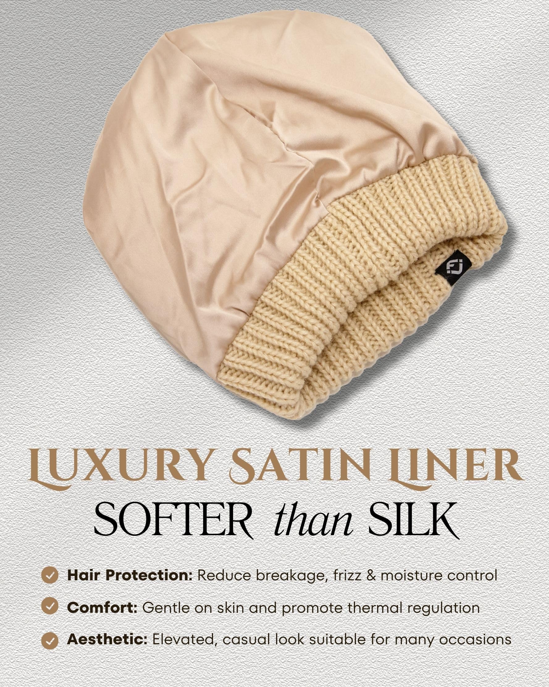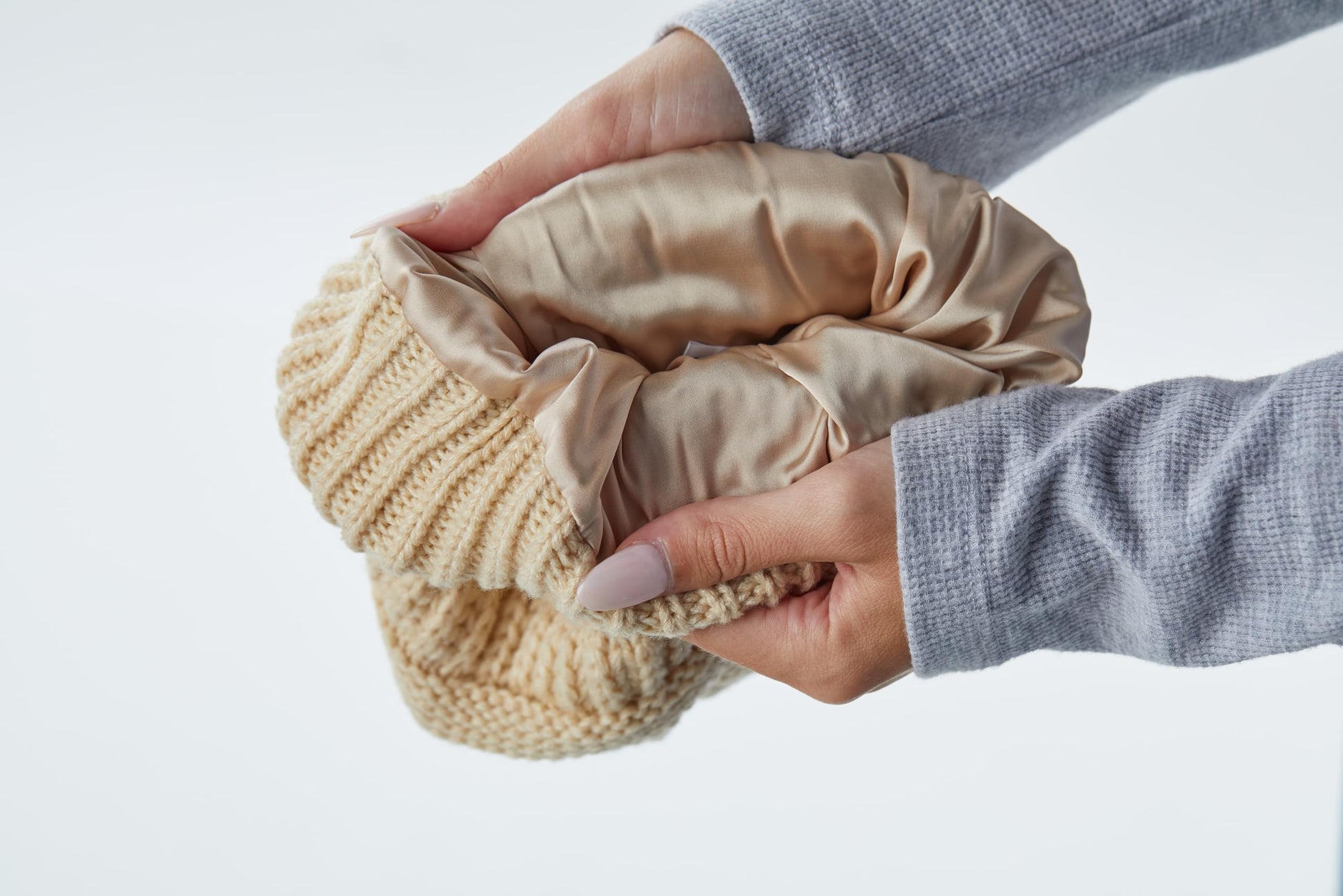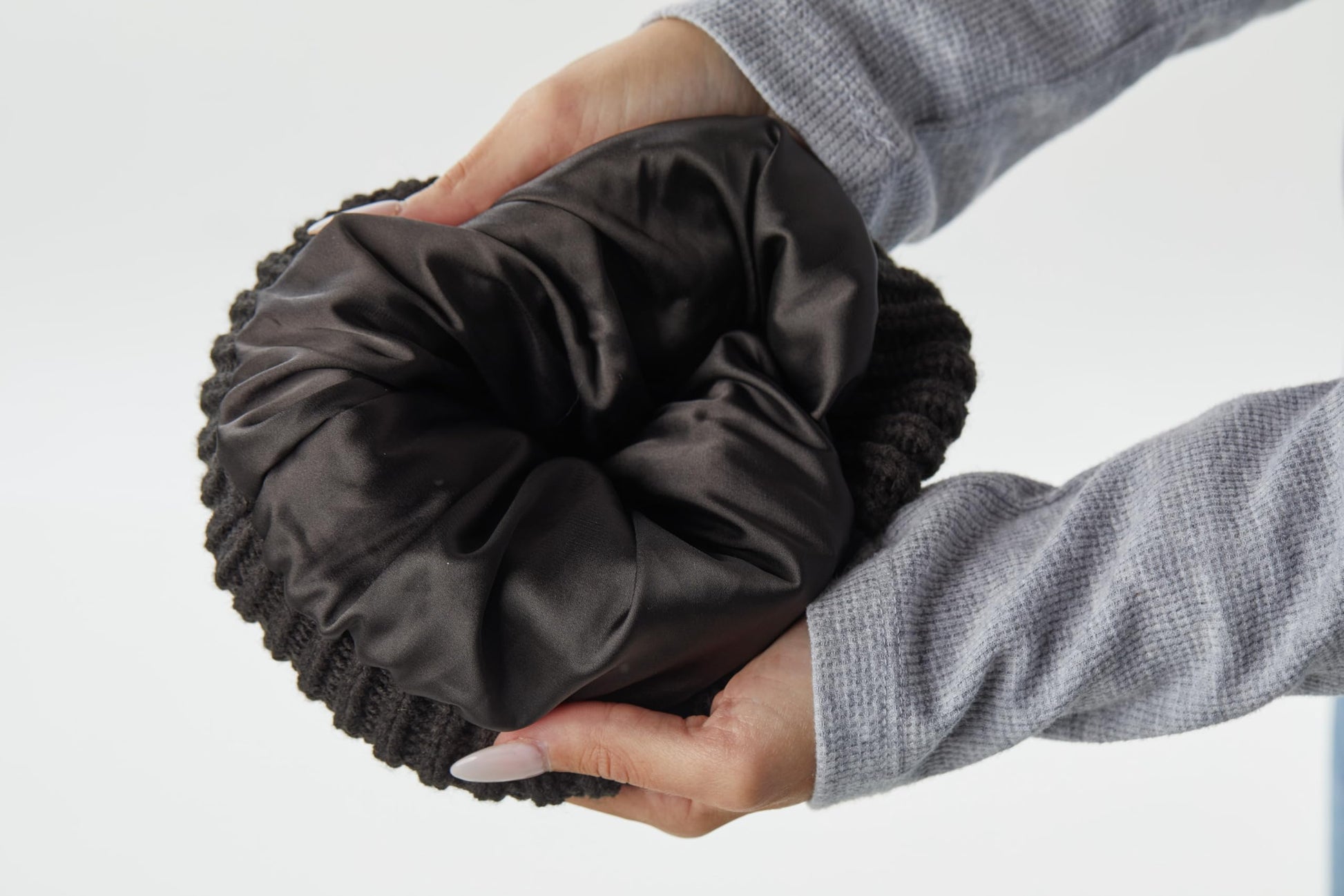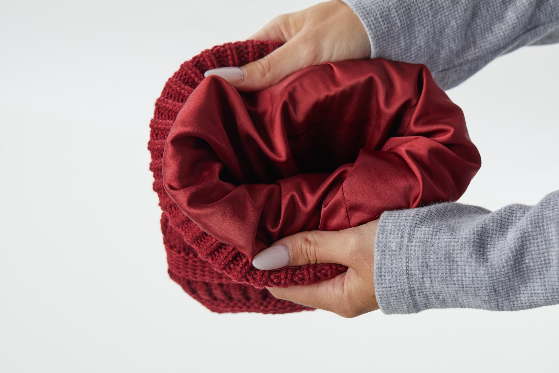 Crafted from a premium 100% acrylic, this beanie features a luxurious polyester satin lining, to ensure that your hair remains smooth and frizz-free. Designed for durability, the outer layer is resistant to pilling, stretching, and fading, ensuring it remains in top condition season after season. The satin lining adds another layer of resilience, providing a smooth barrier that minimizes friction and wear on both the beanie and your hair. Hand wash cold. Lay flat or hang to dry.
