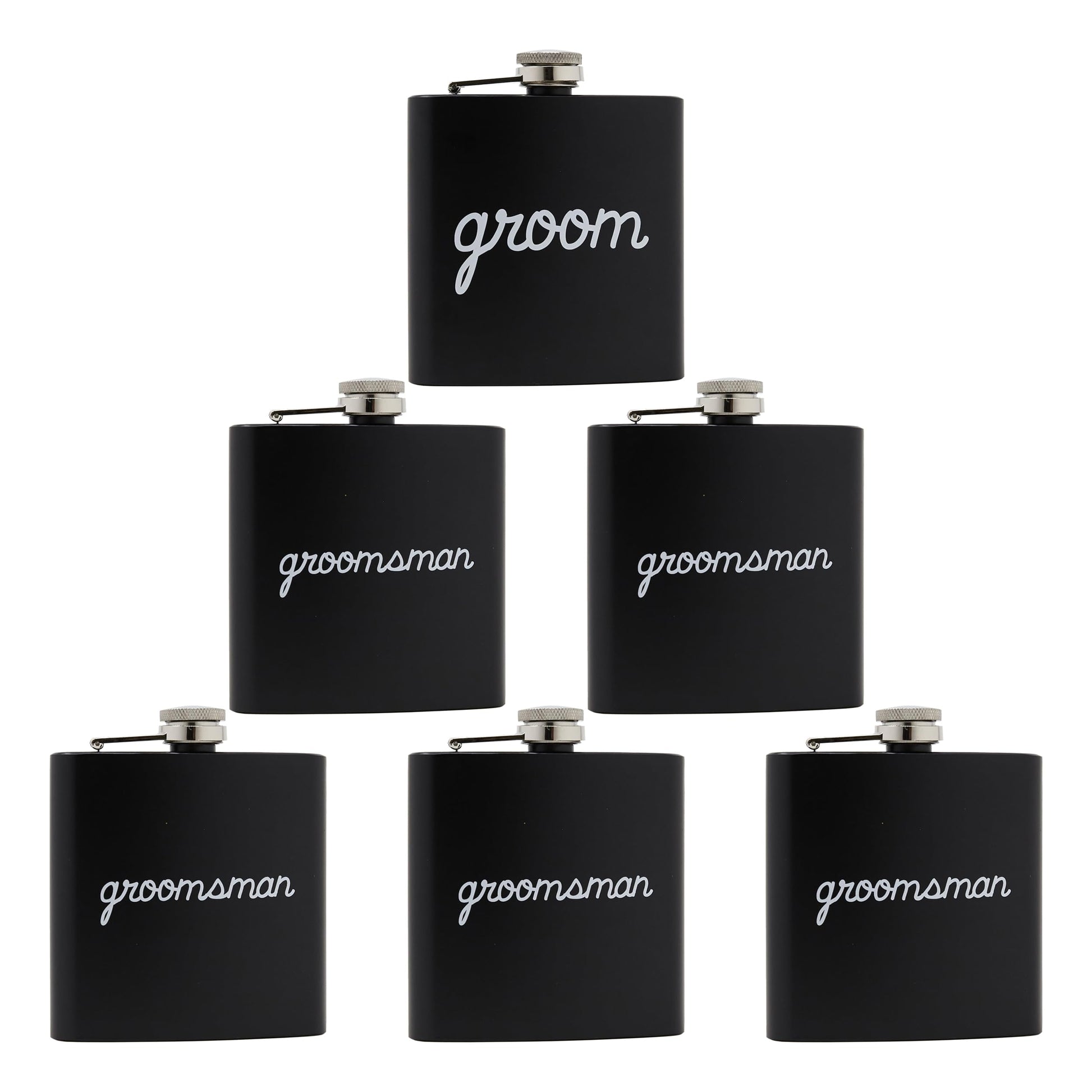 - GREAT LOOK: Whether you're the groom, a groomsman, the bride, or part of the squad, there's a flask tailored just for you. The fun sayings etched onto each flask add a personal touch and are sure to be conversation starters. Fill them up with your liquor of choice, and they're ready to accompany you throughout your festivities. The contrasting black and white designs ensure they stand out, making them not just functional items, but cherished keepsakes of memorable occasions.