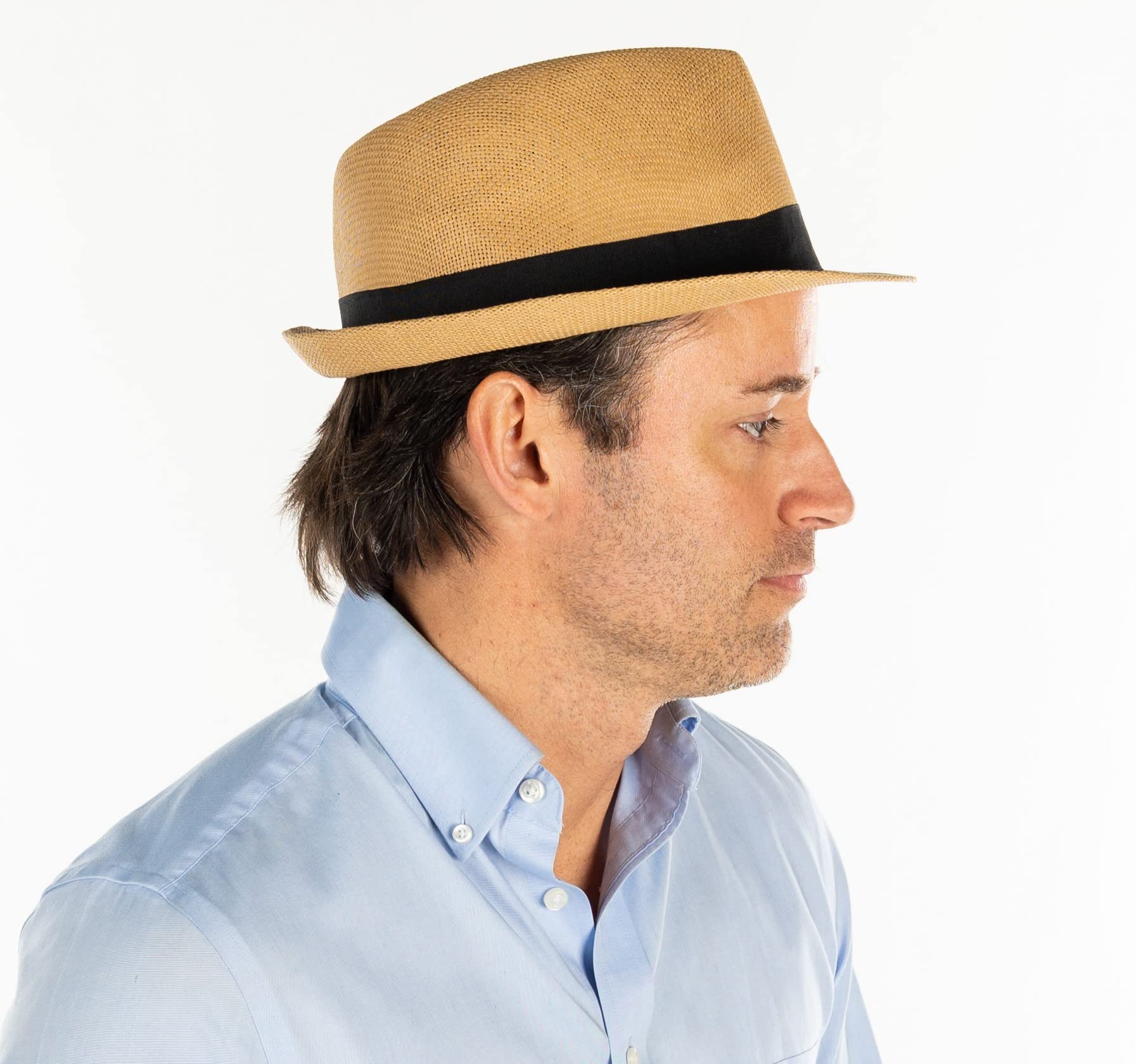 These 100% paper straw fedoras provide you with all day comfort. Super lightweight and breathable, these fashionable hats feature a striking black grosgrain band. It’s the perfect packable hat for your next vacation!